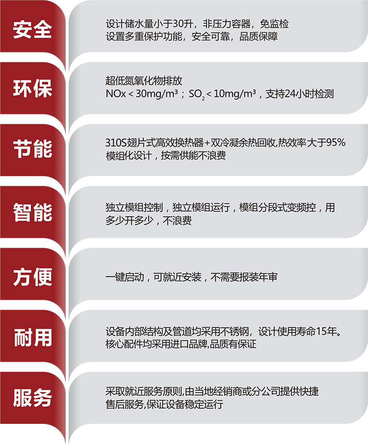 6、綠色環(huán)保,使用清潔天然氣或液化氣作為主要能源,排放遠(yuǎn)低于國家規(guī)定排放標(biāo)準(zhǔn),有益于環(huán)境保護(hù)。